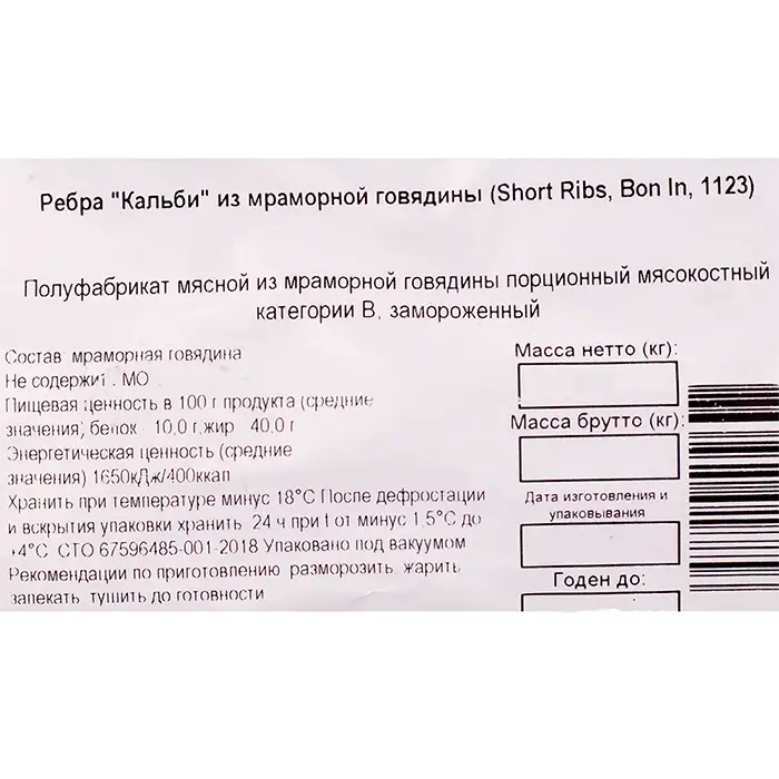 Говядина, резаные ребра Кальби Short Ribs In1123 "ПРАЙМФУДС", 1-1,3 кг