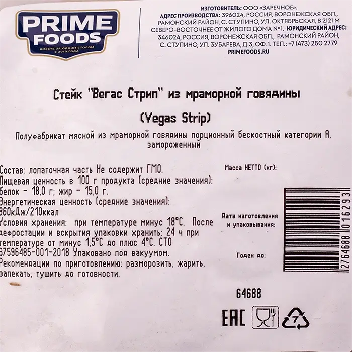 Говядина, стейк Вегас Стрип "ПРАЙМФУДС", 0,6-2 кг