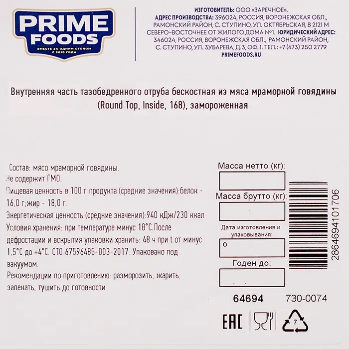 Говядина, внутренняя часть тазобед. отруба Round Top Inside 168 "ПРАЙМФУДС", 6-8 кг
