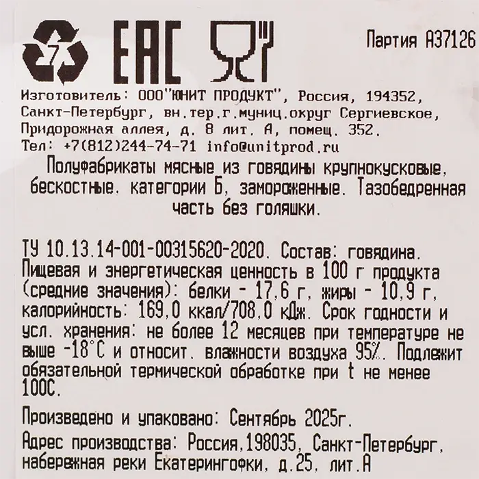 Говядина, тазобедренный отруб без кости "Юнит Продукт", 2-3 кг