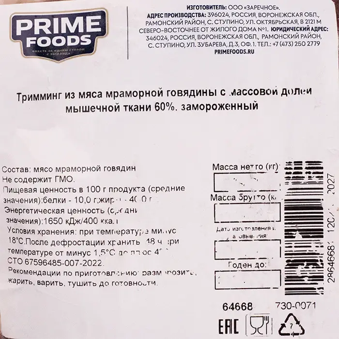 Говядина, тримминг из мраморной говядины 60/40 "ПРАЙМФУДС", 10 кг