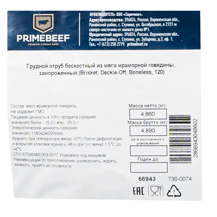 Мраморная говядина, грудной отруб Brisket Deckle-Off 120 «Праймбиф», 4,5–5 кг