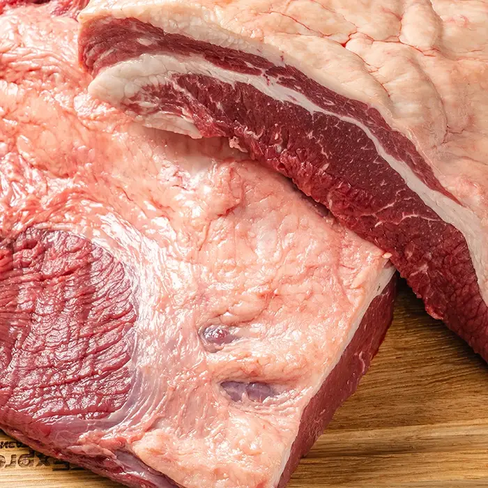 Брискет — отруб из грудинки, сочное мясо с заметной мраморностью.