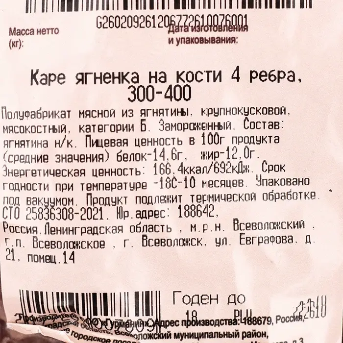 Ягнятина, каре на кости 4 ребра, 600-800 г