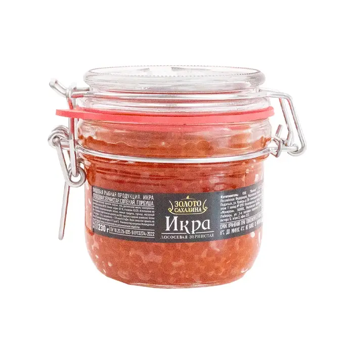 Икра горбуши имеет средний размер (4–6 мм), красно-оранжевый цвет с янтарным отблеском, гладкую тонкую оболочку, свежий аромат и нежный сливочный вкус без горчинки и рыбного запаха.