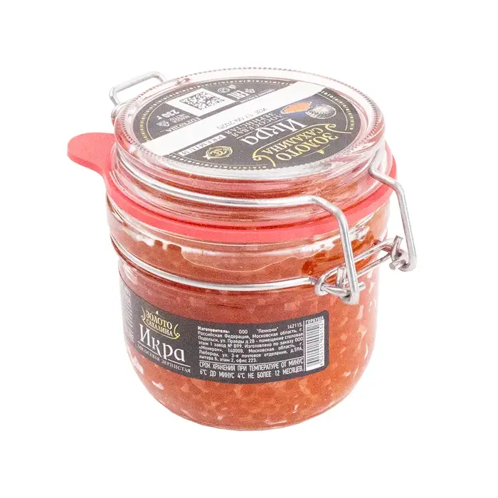Икра лососевая зернистая горбуши, соль, масло растительное, пищевые добавки: влагоудерживающий агент Е422, консерванты: Е200, Е211.
