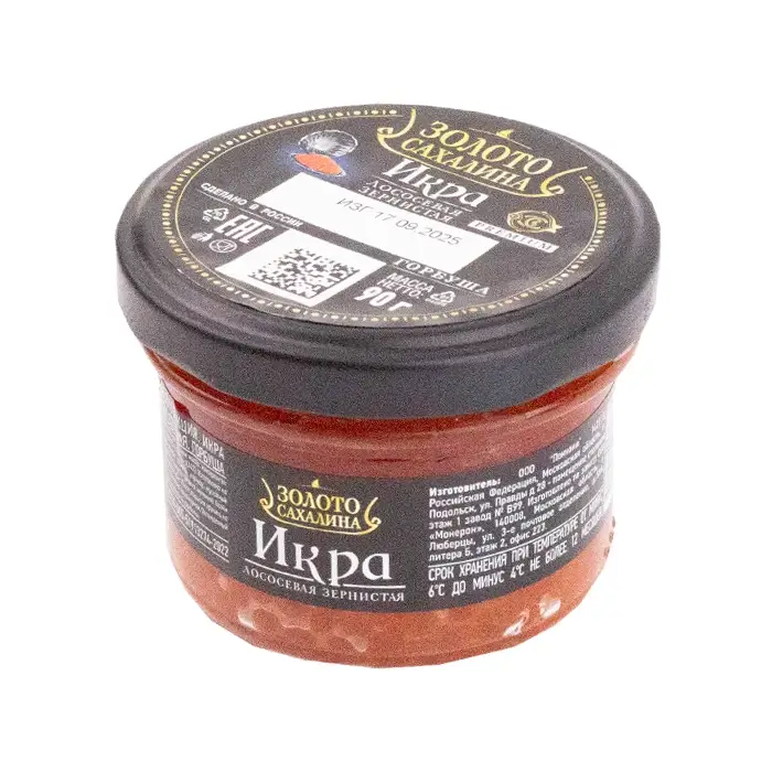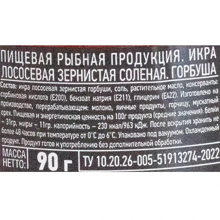 Икра лососевая зернистая горбуши, соль, масло растительное, пищевые добавки: влагоудерживающий агент Е422, консерванты Е200, Е211.