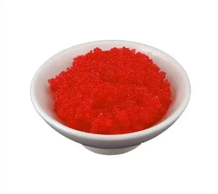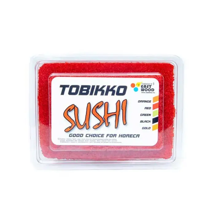 Окрашенная натуральным красителем красная икра летучей рыбы имеет нежный, копчено-солоноватый вкус, хрустящую текстуру. Икринки имеют небольшой размер: 0.5 мм до 0.8 мм.