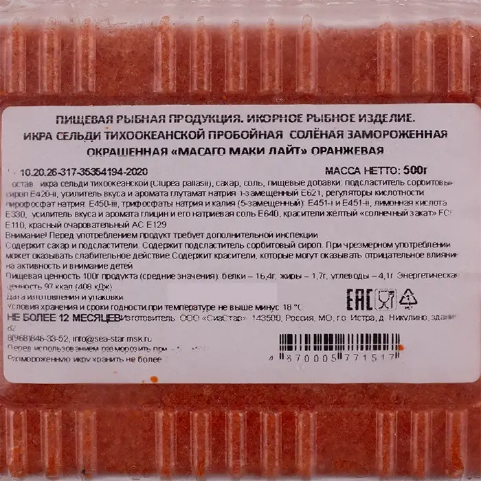 икра сельди тихоокеанской (Clupea pallasil), икра мойвы (Mallotus villosus), сахар, соль, пищевые добавки: подсластитель сорбитоловый сироп Е-420-ii, усилитель вкуса и аромата: глутамат натрия 1-замещенный Е-621, регуляторы кислотности: пирофосфат натрия Е450-iii, трифосфаты натрия и калия (5-замещенный): Е0451-i и Е451-ii, лимонная кислота Е330, подсластитель: экстракт стевии, усилитель вкуса и аромата глицин, натриевая соль Е640, краситель желтый "Солнечный закат" FCF Е110, краситель красный "Очаровательный" АС Е129