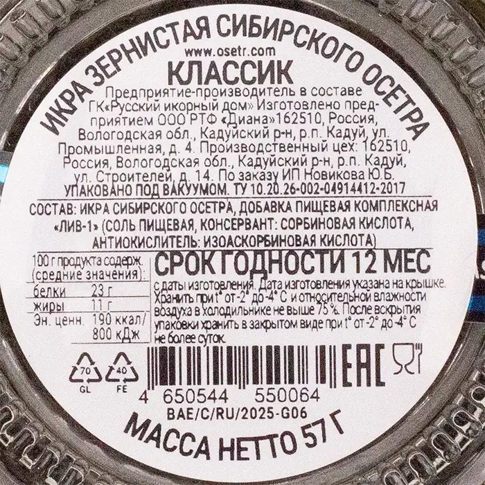 Икра сибирского осетра, добавка пищевая комплексная "ЛИВ-1" (соль пищевая, консервант: сорбиновая кислота, антиокислитель: изоаскорбиновая кислота)