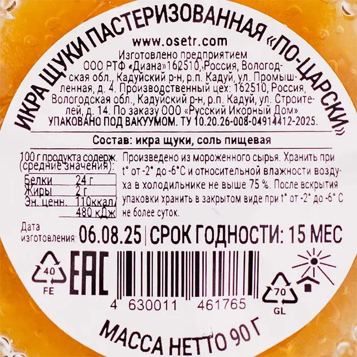 Традиционная русская деликатесная закуска высшего качества. Изготовлена из свежей икры щуки методом пастеризации, позволяющим сохранить естественный вкус и полезные свойства продукта.