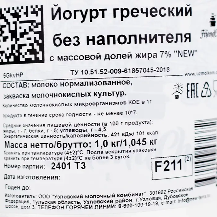 Молоко нормализованное, молочный белок, закваска молочных культур.