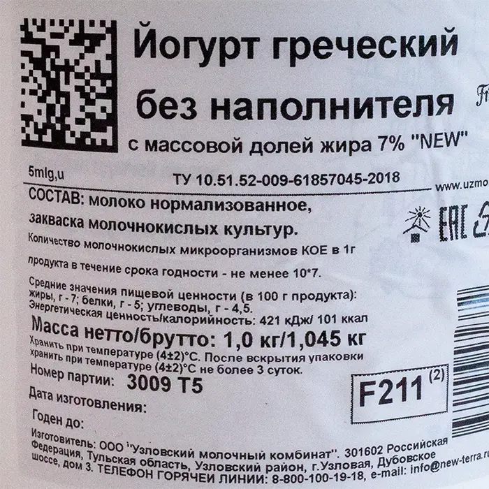 Молоко нормализованное, молочный белок, закваска молочных культур.