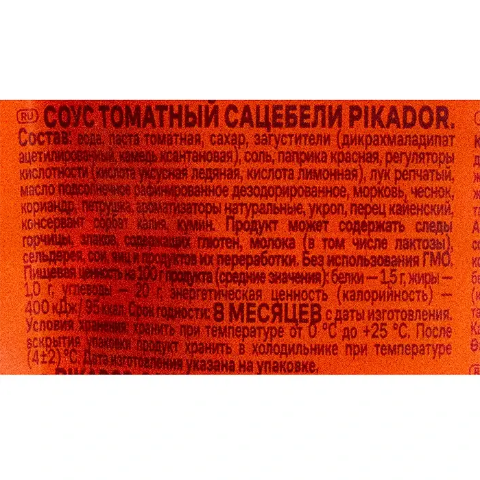 Вода, паста томатная, сахар, загустители, соль, паприка красная, регуляторы кислотности, лук репчатый, масло растительное рафинированое, морковь, чеснок, кориандр, петрушка, ароматизаторы натуральные, БЕЗ ИСПОЛЬЗОВАНИЯ ГМО