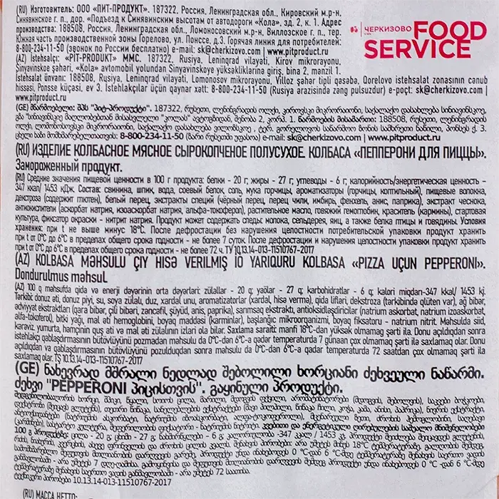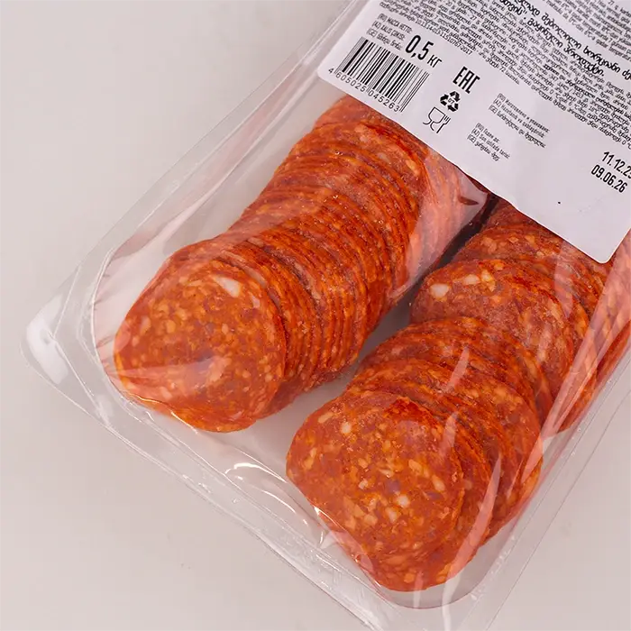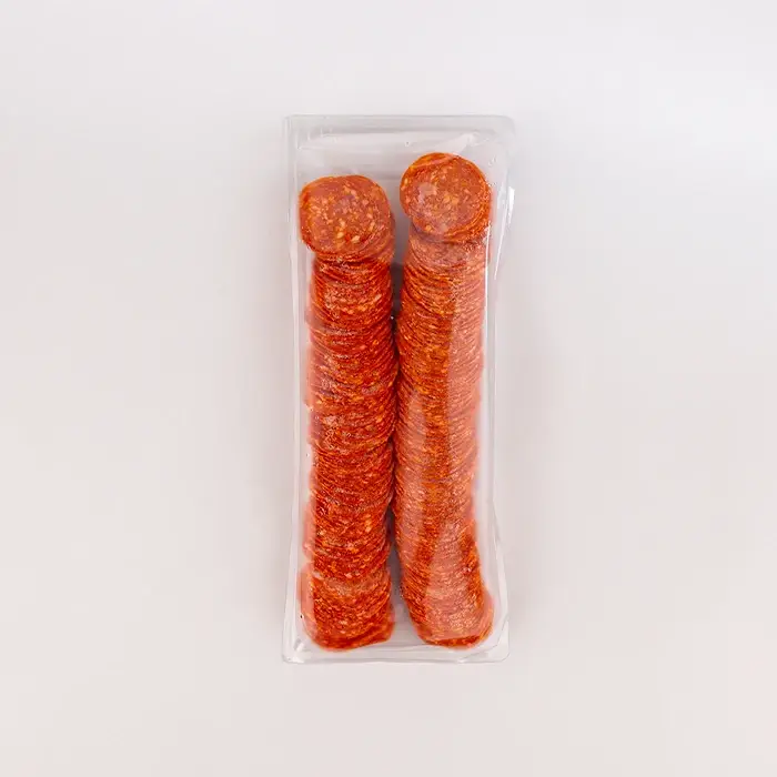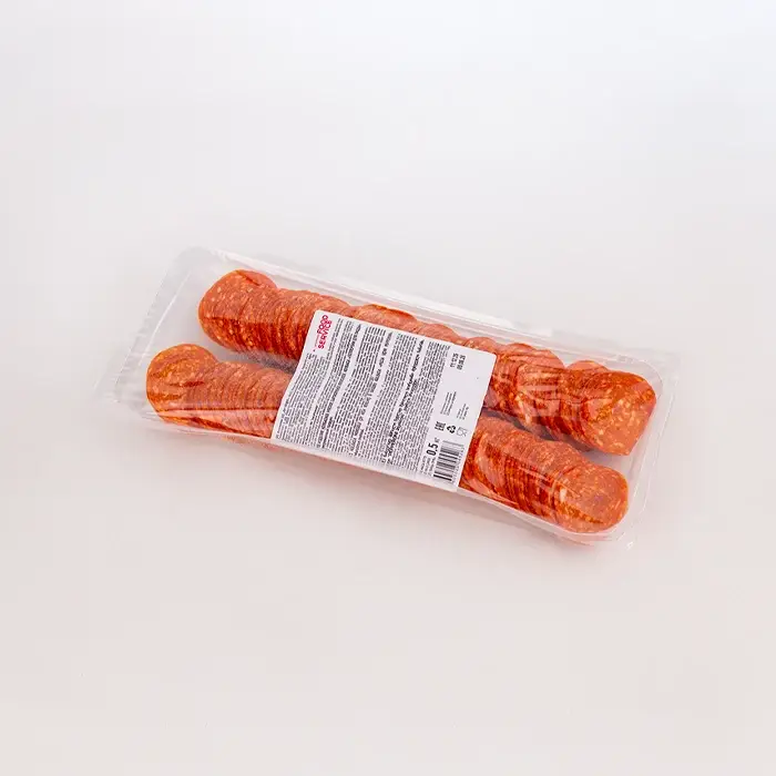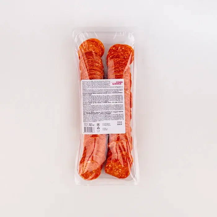 Пепперони — разновидность салями, сырокопченая колбаса с пикантным мясным вкусом и копченым ароматом с пряными нотами, имеет яркий цвет и упругую, плотную текстуру. Нарезанные слайсы без оболочки легко отделяются друг от друга, что экономит время и сокращает работу на кухне.