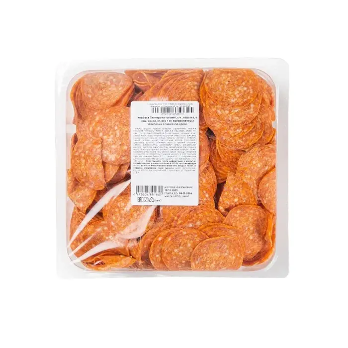 Яркая копченая колбаса с чили и копченой паприкой в составе имеет упругую консистенцию, островатый вкус и насыщенный аромат. Продукт подходит для пиццы, пасты, салатов и закусок, бутербродов.