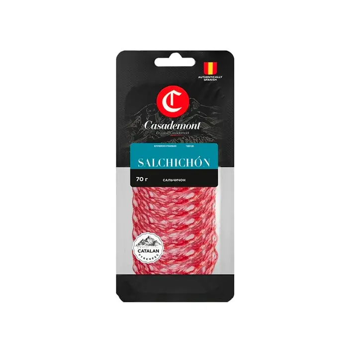 Сыровяленая полусухая колбаса изготавливается из отборной свинины, в процессе созревания покрывается белой плесенью. Сальчичон имеет насыщенный мясной вкус с рассольно-сливочными нотами, плотную текстуру и пряный аромат с оттенком мускатного ореха и черного перца.