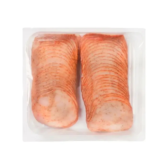 Филе куриное, вода, крахмал картофельный, нитритно-посолочная смесь (соль, фиксатор окраски-нитрит натрия), специи и экстракты специй (перец черный, кориандр, паприка, горчица, лук, чеснок), регуляторы кислотности (трифосфат натрия, ацетаты натрия , пирофосфат натрия), сыворотка молочная, усилитель вкуса и аромата (глутамат натрия), сахар, рапсовое масло, дрожжевой экстракт, глюкоза,стабилизатор (ксантановая камедь), агенты желирующие (хлорид калия, каррагинан), антиокислитель (изоаскорбат натрия, лимонная кислота, винная кислота, пиросульфит натрия), ароматизатор коптильный, ароматизатор.