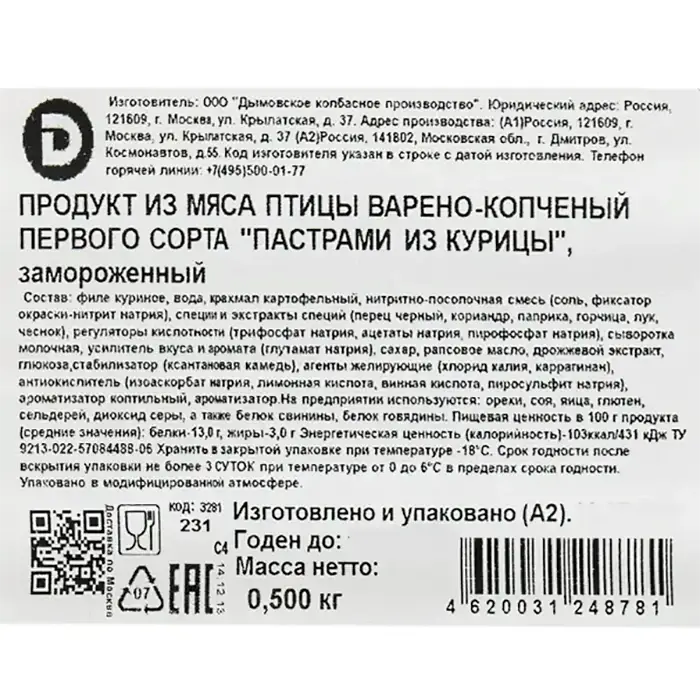 Пастрами из варено-копченой курицы «Дымов», нарезка, 500 г