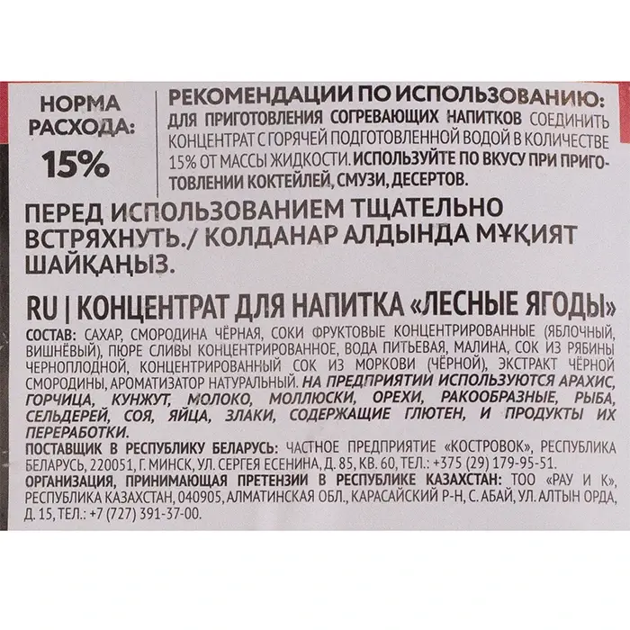 Натуральный концентрированный напиток, приготовленный из отборных лесных ягод. Обладает ярким вкусом и ароматом дикой природы. Идеально подходит для приготовления освежающих напитков, компотов и морсов.