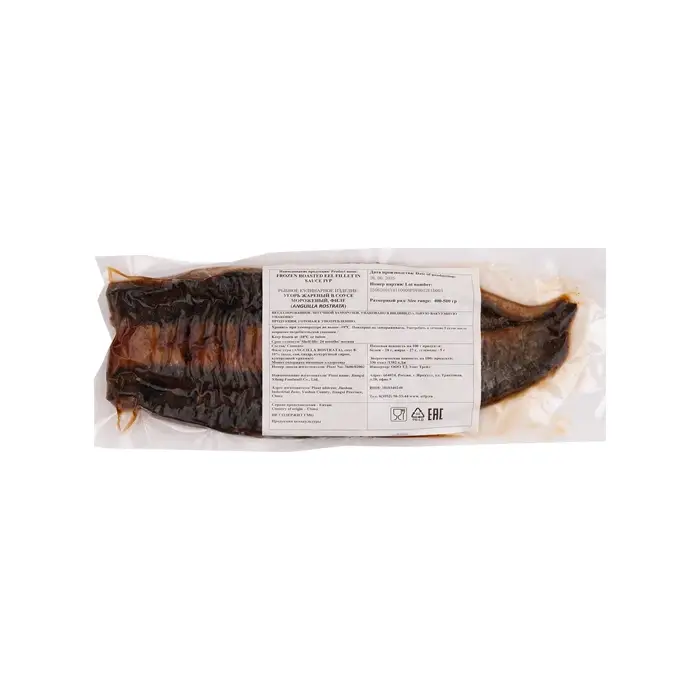 Угорь жареный копченый технической обработки без добавления соусов массой 400-500 гр представлен упаковками общего веса 1 кг.