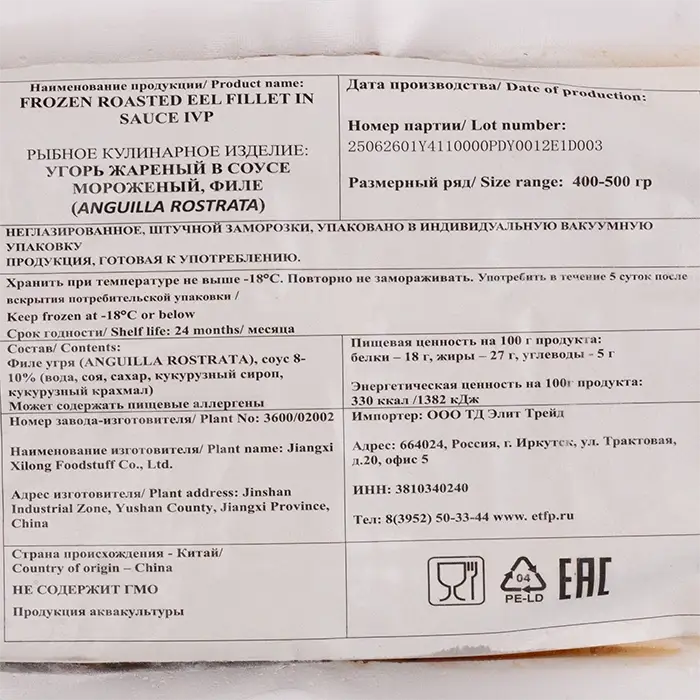 Филе угря, соус 8-10% (вода, соя, сахар, кукурузный сироп, кукурузный крахмал)