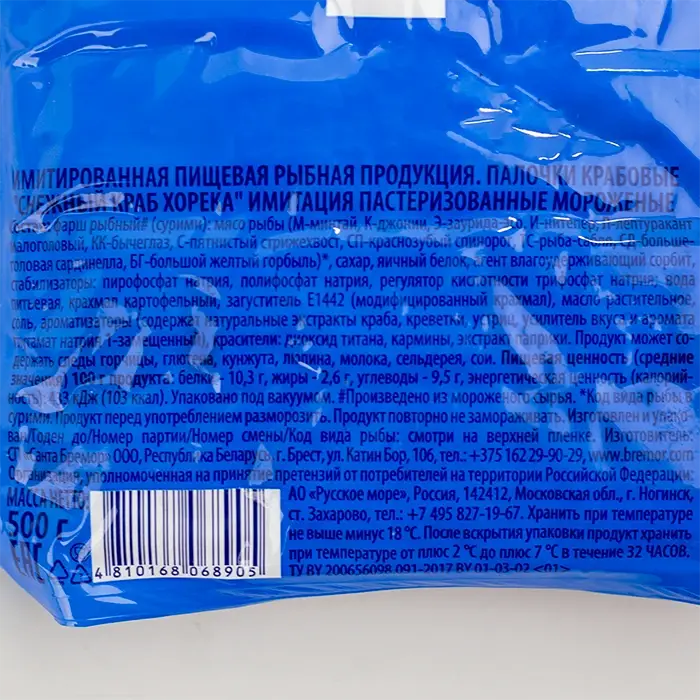 Фарш рыбный (сурими): мясо рыбы (К-джонии, Э-заурида-эсо, И-нитепер, Л-лептуракант малоголовый, КК-бычеглаз, С-пятнистый стрижехвост, СП-краснозубый спинорог, ТС-рыба-сабля, СД-большеголовая сардинелла, БГ-большой желтый горбыль, А-макруронус американский), сахар, яичный белок, агент влагоудерживающий сорбит, стабилизаторы: пирофосфат натрия, полифосфат натрия, вода питьевая, крахмал картофельный, загуститель Е1442 (модифицированный крахмал), масло растительное, соль, ароматизаторы (содержат натуральные экстракты краба, креветки, устриц, усилитель вкуса и аромата: глутамат натрия 1-замещенный), красители: диоксид титана, кармины, экстракт паприки.