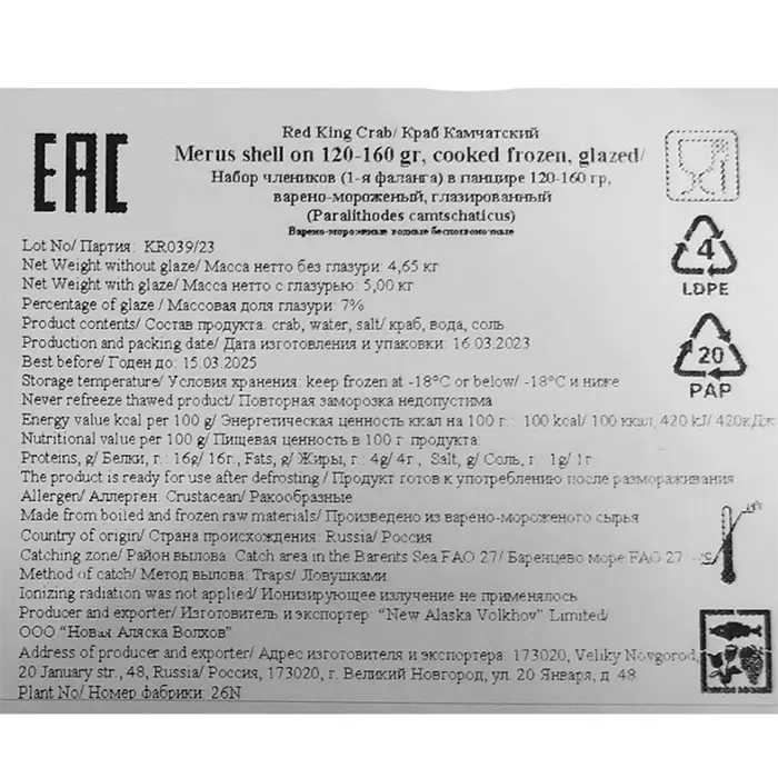 Камчатский краб варено-мороженый 1-я фаланга в панцире «Новая Аляска Волхов», глазурь 7%, 120-200 г