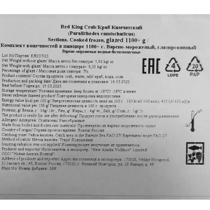 Тонкая ледяная глазурь 7 % защищает продукт от заветривания, механических повреждений, позволяет продлить свежесть и сохранить вкус.