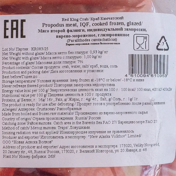 Мясо 2-й фаланги Камчатского краба «Новая Аляска Волхов», 1 кг