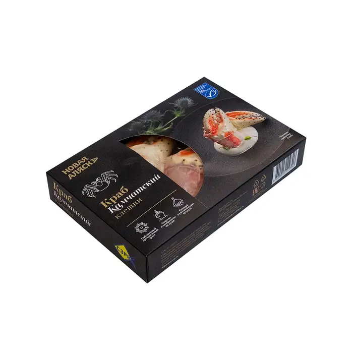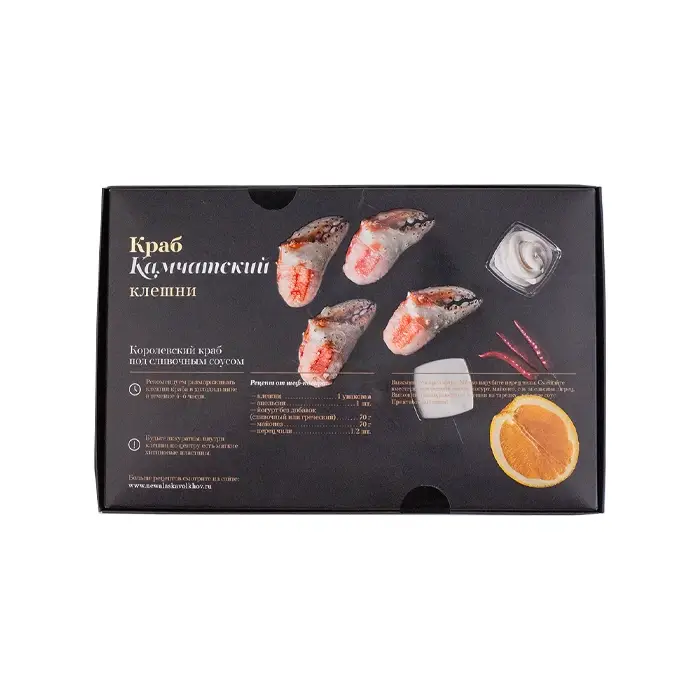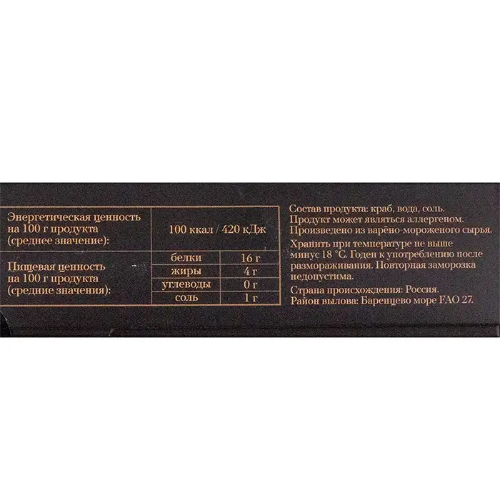 Варено-мороженое сочное белое с ярко-красными вкраплениями мясо обладает сладковатым вкусом, насыщенным ароматом с нотами морской свежести, мягкой и нежной текстурой. Краб очищен от хитина. Глазурь 7% защищает от воздействий окружающей среды: заветривания, механических повреждений, помогает сохранить свежесть и вкус на протяжении всего срока годности.