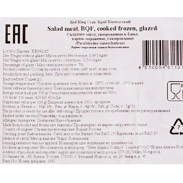 Варено-мороженое сочное белое с ярко-красными вкраплениями мясо обладает сладковатым вкусом, насыщенным ароматом с нотами морской свежести, мягкой и нежной текстурой. Краб очищен от хитина. Глазурь 7% защищает от воздействий окружающей среды: заветривания, механических повреждений, помогает сохранить свежесть и вкус на протяжении всего срока годности.