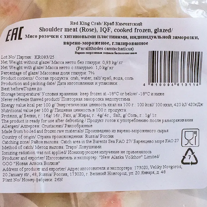 Варено-мороженое мясо розы Камчатского краба, 1 кг