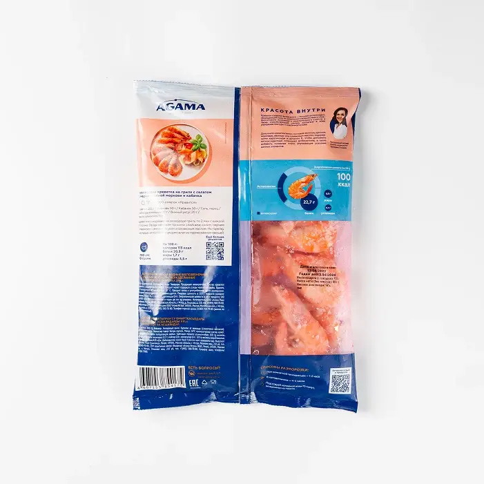 Тонкая ледяная глазурь и герметичная упаковка защищают креветки от заветривания и механических повреждений. Шоковая заморозка сохраняет свежесть и сочность мяса.