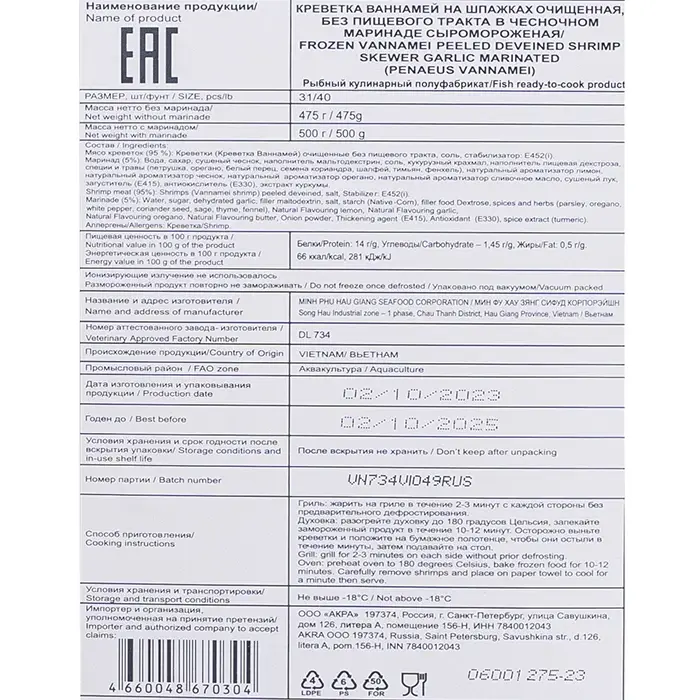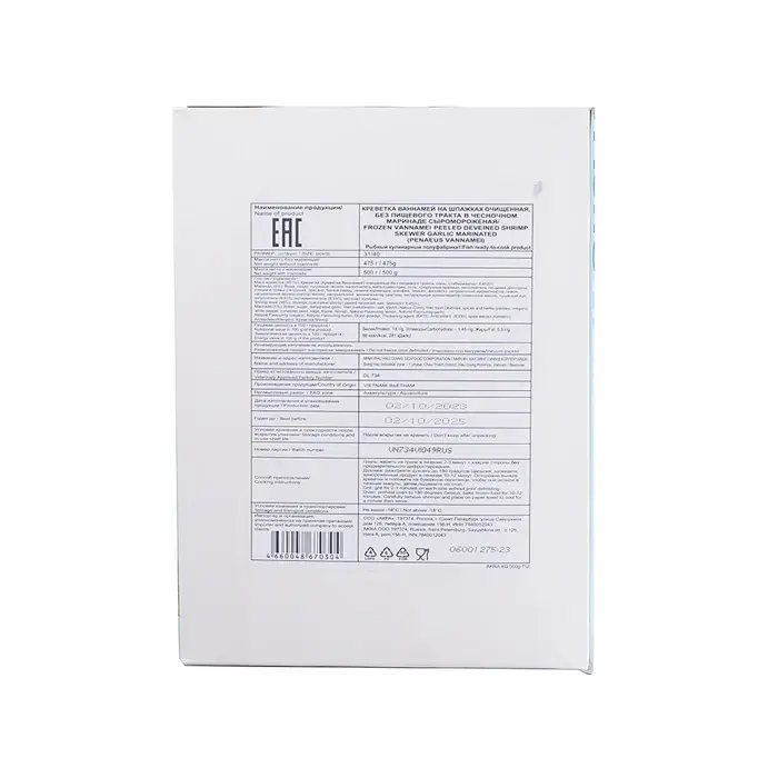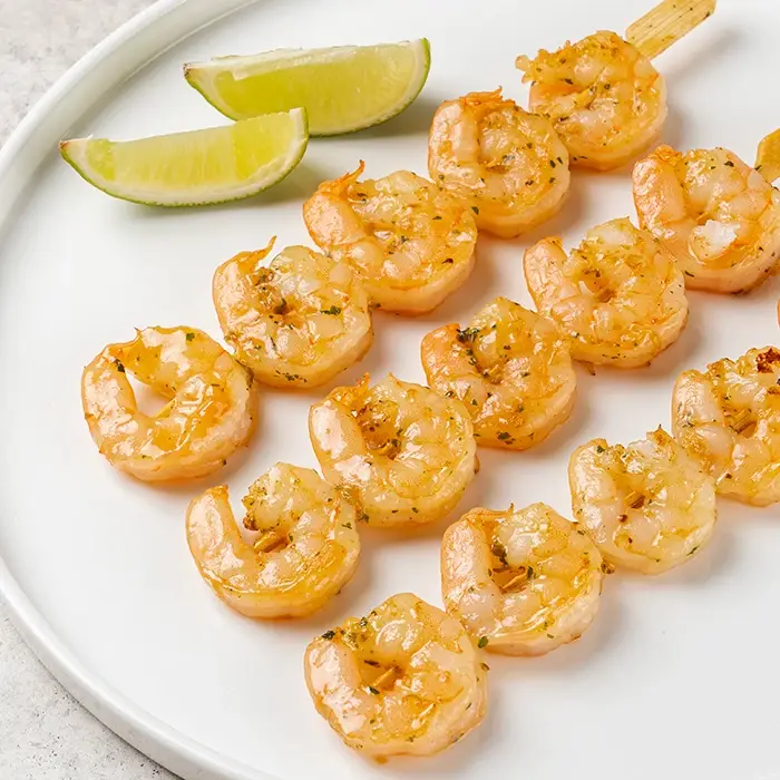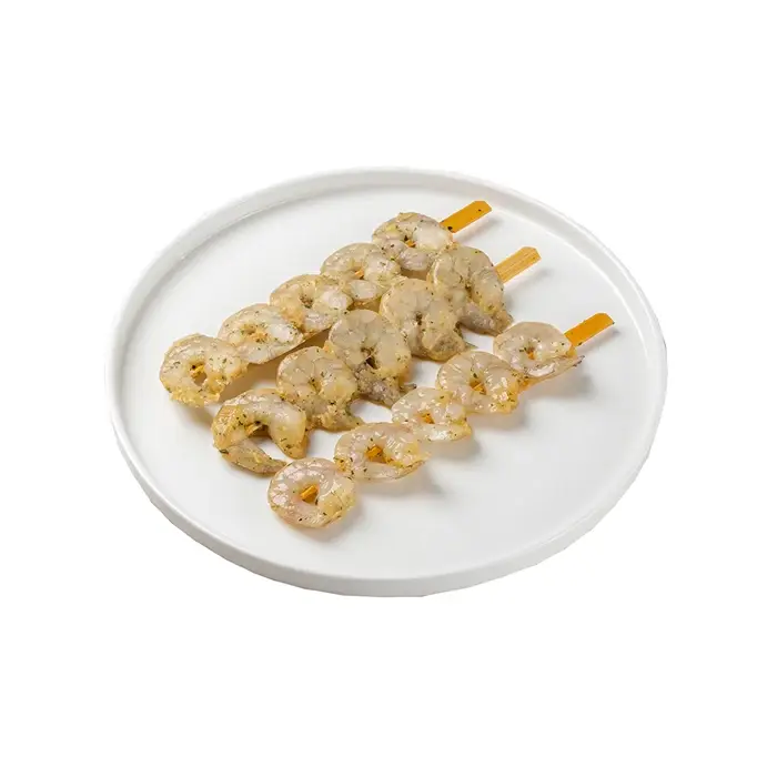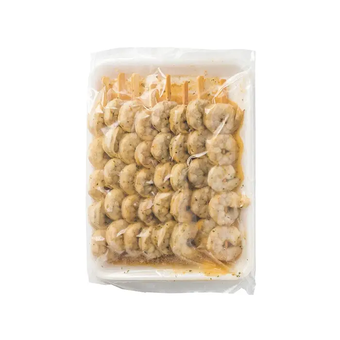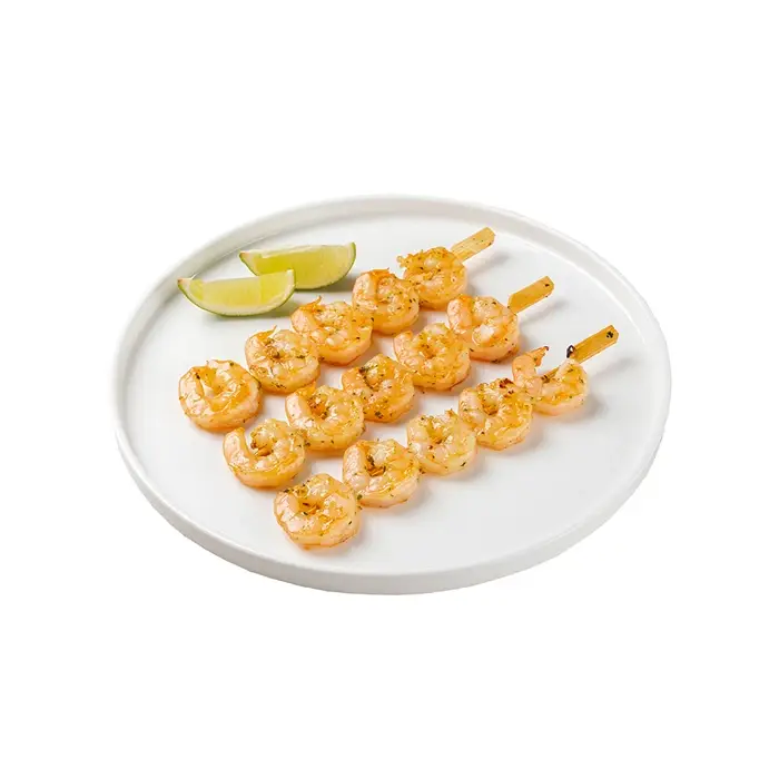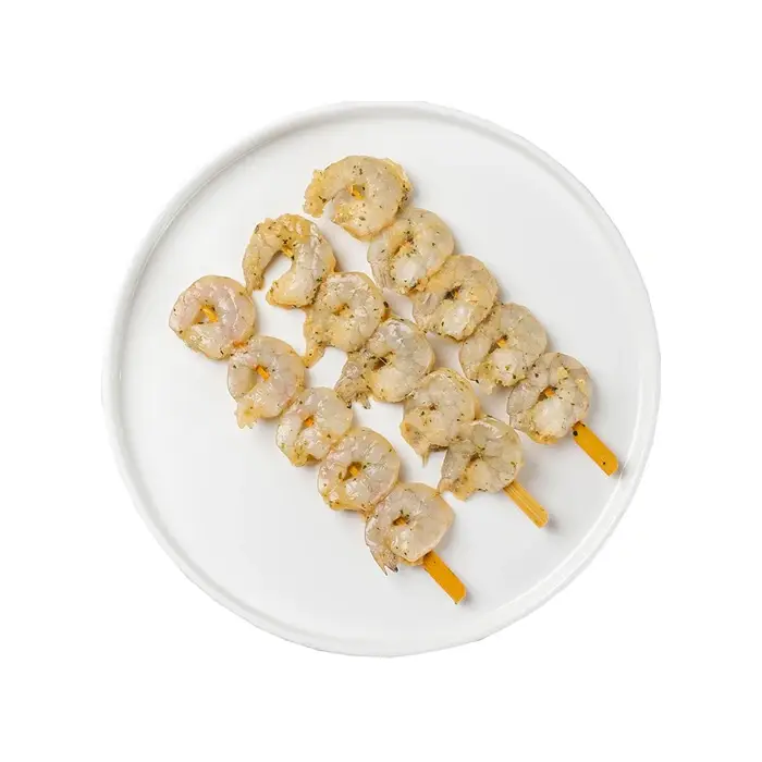 Креветки на шпажках уже очищены, замаринованы в чесночном соусе с травами. Они имеют легкий и пикантный вкус чеснока, пряный аромат, нежную и сочную текстуру. Размер креветок — 31/40.