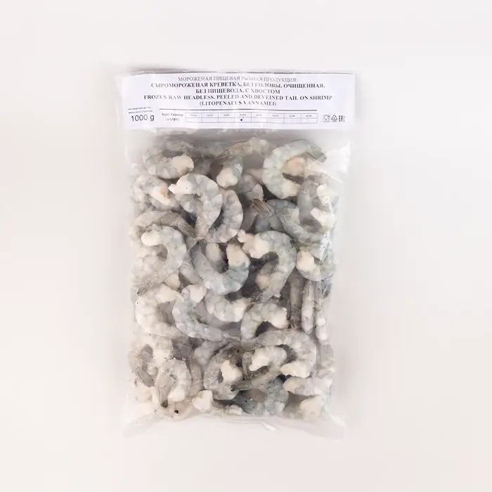 Тигровые креветки, выловленные из вод Вьетнама, с хвостом, очищены от головы и панциря. Креветки имеют серо-синий оттенок, плотную, упругую, сочную текстуру, сладковатый вкус и легкий морской аромат.