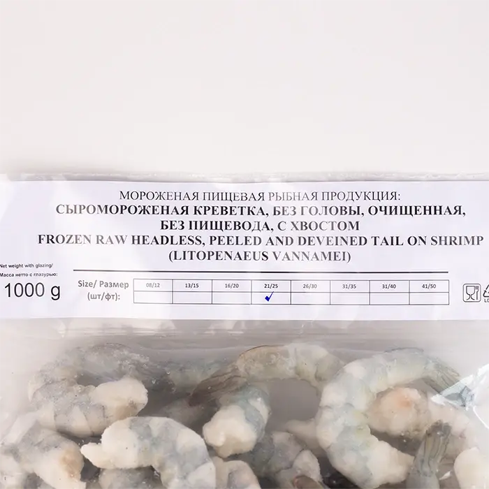Калибровка 21 / 25 означает, что в одном фунте содержится от 21 до 25 креветок — крупный размер (длина около 10 см).
