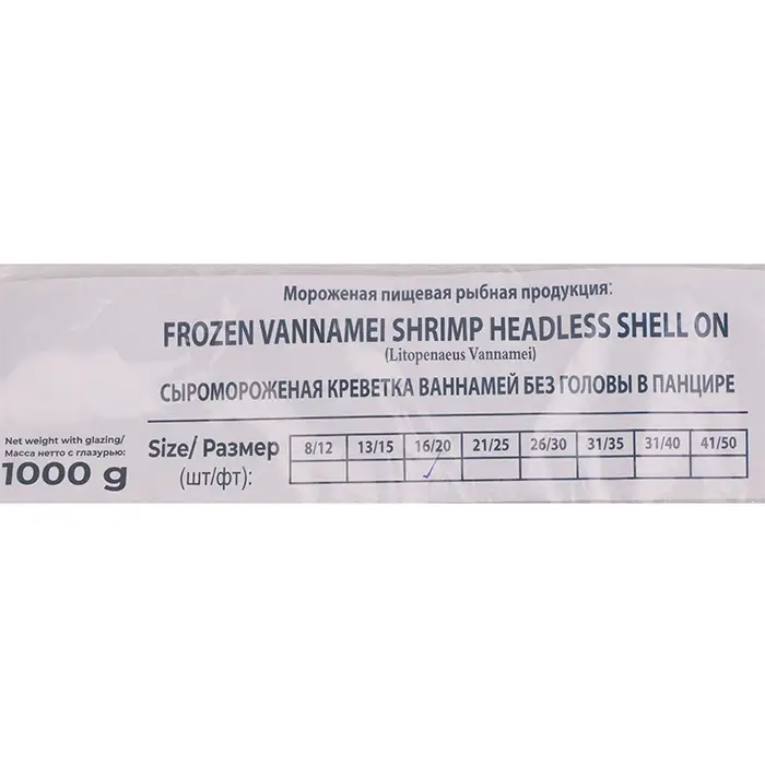 Креветки тигровые свежемороженые без головы 16/20, "Phuong Anh Seafood", глазурь 7%, 1 кг
