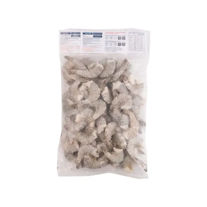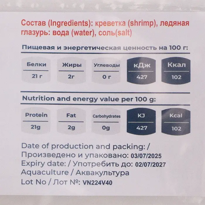 Креветки заморожены блоком для сохранения формы и предотвращения высыхания и заветривания.