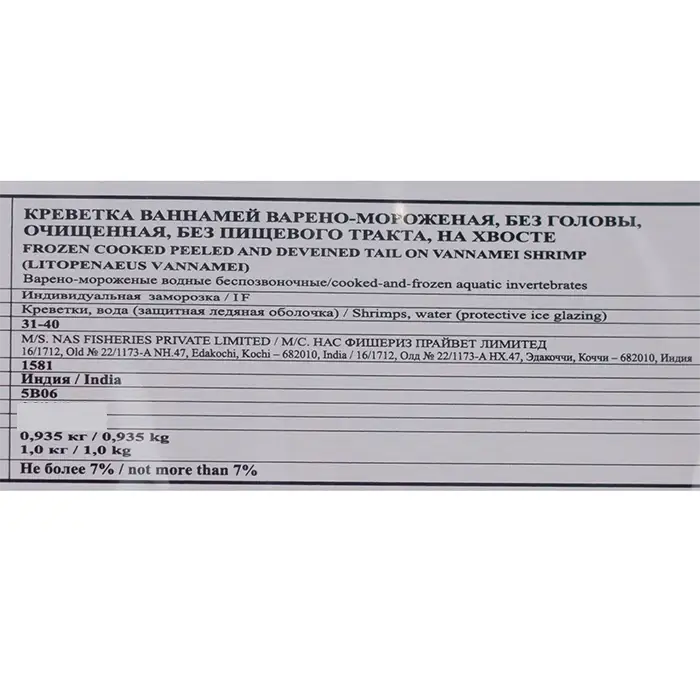 Креветки тигровые вареномороженные очищенные без хвоста 31/40, глазурь 7%, 1 кг