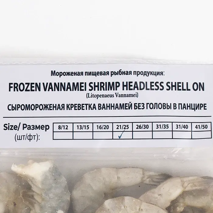 Калибровка 21 / 25 означает, что в одном фунте содержится от 21 до 25 креветок — крупный размер.