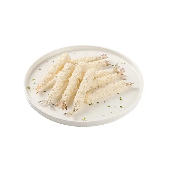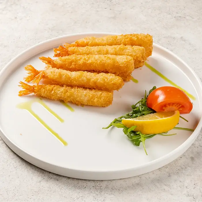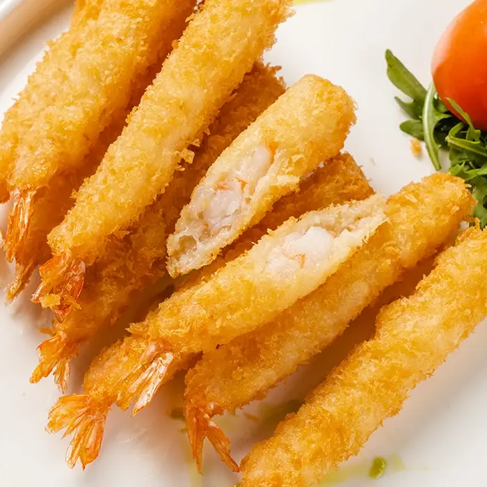 Креветка Ваннамей очищенная с хвостом вытянутой формы в хрустящей панировке. Вкусное самостоятельное блюдо! А также станет вкусным дополнением вашей закусочной тарелки.