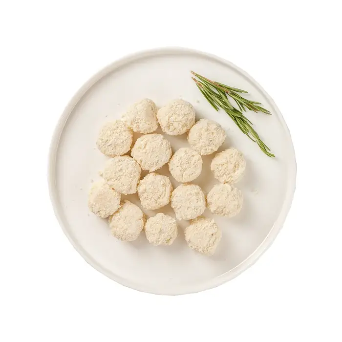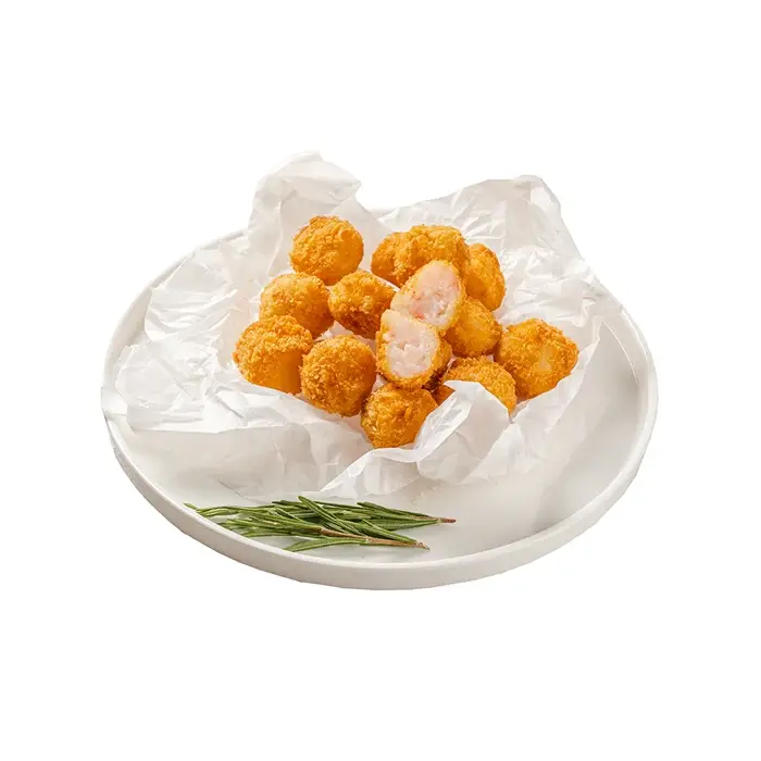 Шарики из рубленой королевской креветки под хрустящей пышной панировкой с нежным и сочным мясом внутри. Размер каждой креветки 21/25.