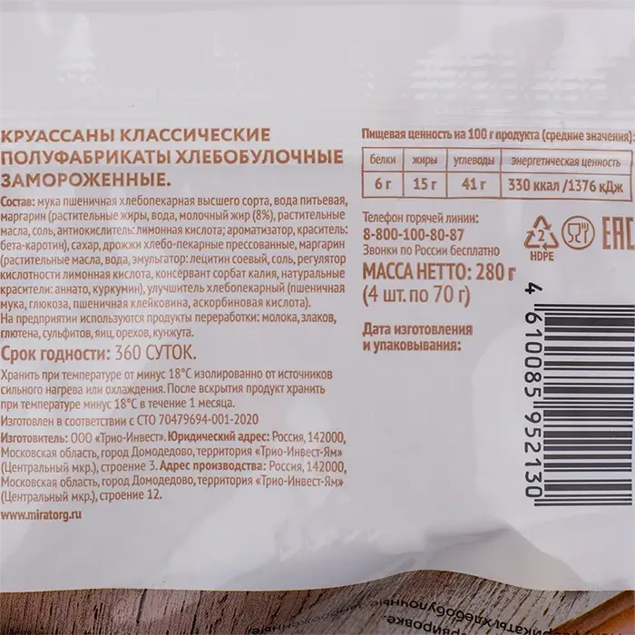 Мука пшеничная хлебопекарная высшего сорта, вода питьевая, маргарин (растительные жиры, вода, молочный жир (8%), растительные масла, соль, антиокислитель (лимонная кислота), ароматизатор, краситель (бета-каротин), сахар, дрожжи хлебопекарные прессованные, маргарин (растительные масла, вода, эмульгатор – лецитин соевый, соль, регулятор кислотности – лимонная кислота, консервант – сорбат калия, натуральные красители: аннато, куркумин), улучшитель хлебопекарный (пшеничная мука, глюкоза, пшеничная клейковина, аскорбиновая кислота). На предприятии используются продукты переработки молока, злаков, глютена, сульфитов, яиц, орехов, кунжута.
