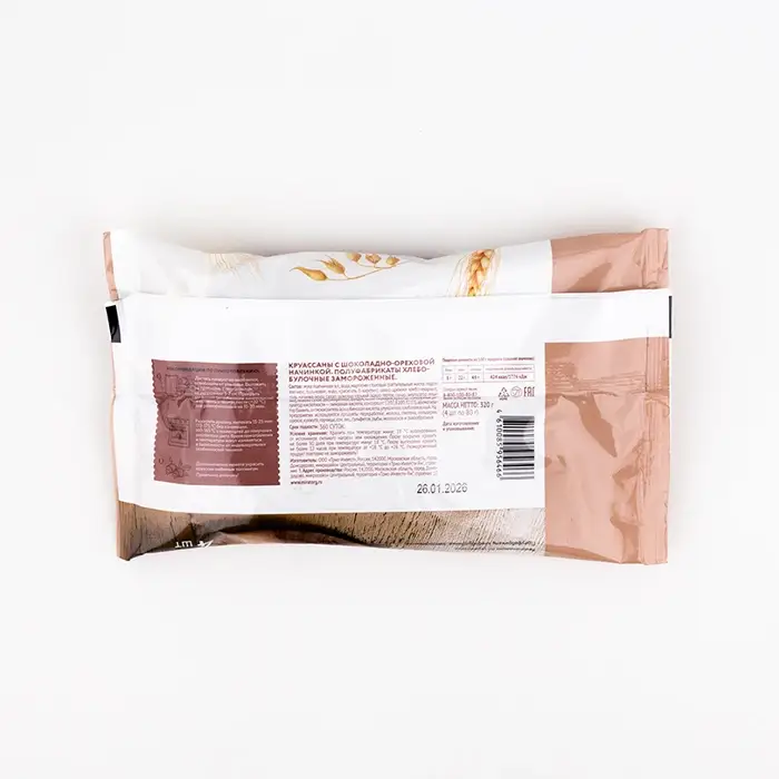 Круассан имеет легкую, воздушную и пористую структуру с хрустящей при надломе корочкой, насыщенный вкус какао с ореховым послевкусием и яркий аромат выпечки с масляными нотами. Начинка сохраняет шоколадную кремообразную текстуру с кусочками орехов.