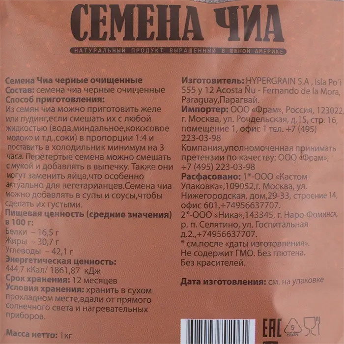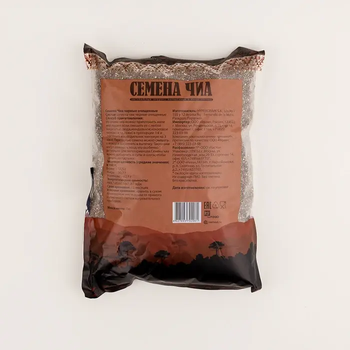 Семена Чиа — очищенные черные семена испанского шалфея, произрастающего в Южной Америке. В сухом виде семена имеют плотную, хрустящую текстуру, схожу с маковыми семенами. При контакте с жидкостью образуют желеобразную массу: они впитывают влагу и увеличиваются в объеме, образуя гелеобразный слой. Вкус у семян нейтральный с легкими ореховыми нотами. Продукт не содержит ГМО, глютен, красители и консервант.