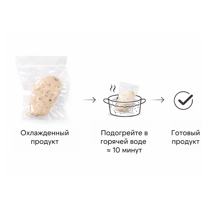Погрузите продукт в вакуумной упаковке (сняв этикетку) в горячую воду (около +80 °C) в течение 10—15 минут. Затем после вскрытия продукт готов к употреблению.