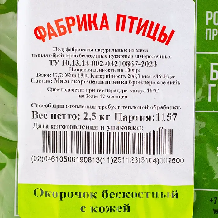 Курица, филе окорочка без кости на коже «Фабрика птицы», 2,5 кг