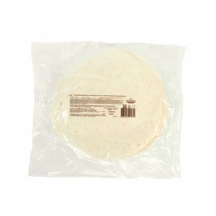 Тонкая круглая пшеничная лепешка имеет плотную текстуру, хорошо скручивается, не размокает.