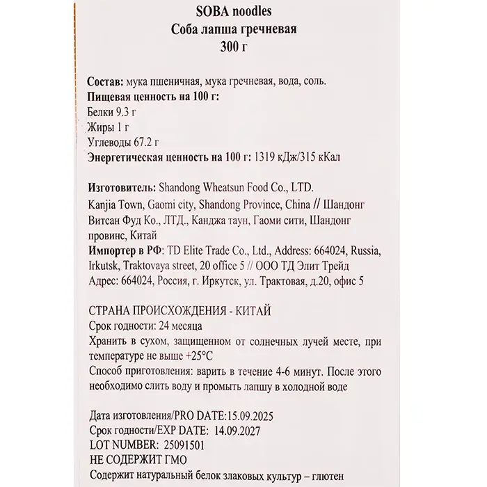 Лапша гречневая Соба Wheatsun Food, 300 гр